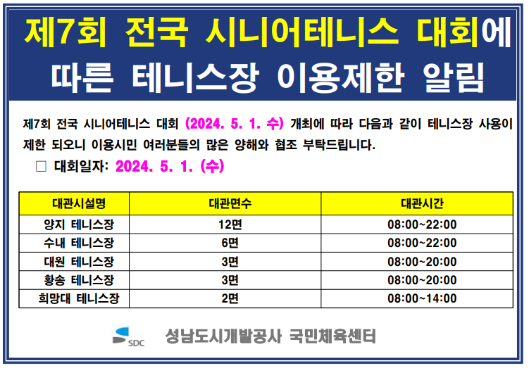 테니스 대회 개최로 사용이 제한되오니 이용시민 여러분들의 많은 양해와 협조 바랍니다.