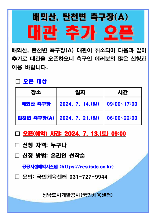 대회일정 변경에 따른 배뫼산,탄천변A축구장 추가 오픈 알림