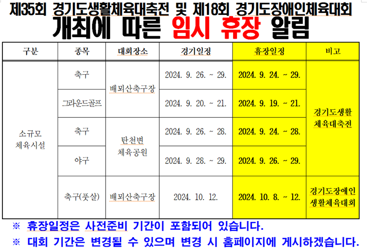 제35회 경기도생활체육대축전 및 제18회 경기도장애인체육대회 개최에 따른 임시휴장 알림