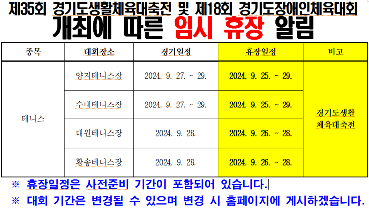제35회 경기도생활체육대축전 및 제18회 경기도장애인체육대회 개최에 따른 임시휴장 알림