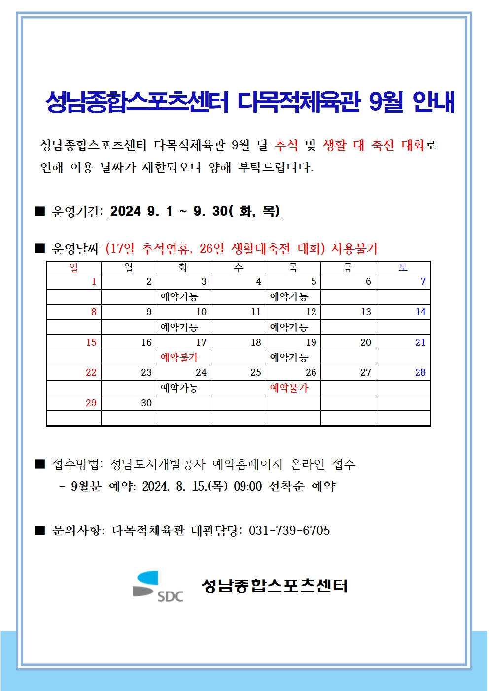 성남종합스포츠센터 다목적체육관 9월 달 추석 및 생활 대 축전 대회로 인해 이용 날짜가 제한되오니 양해 부탁드립니다.