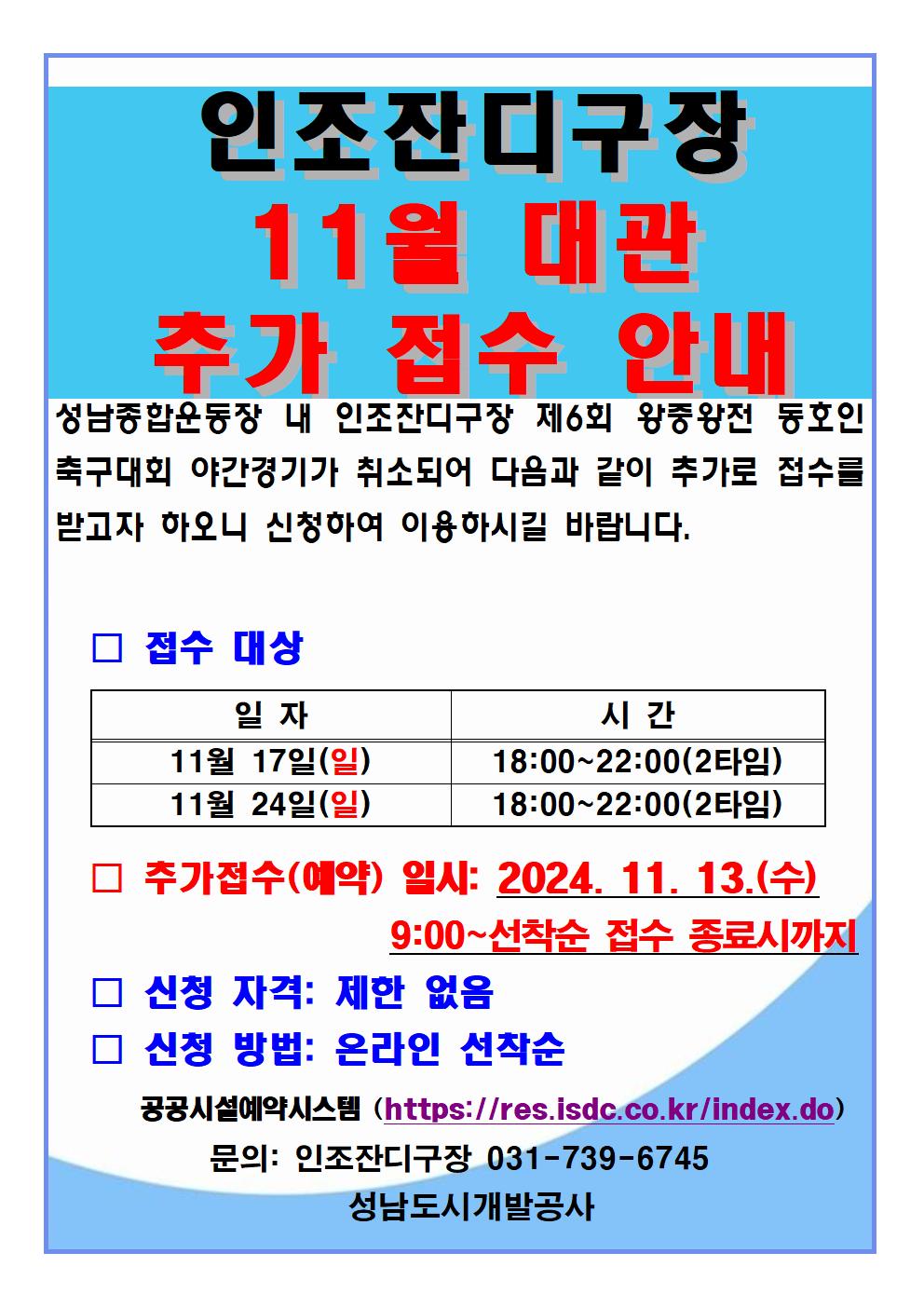 성남종합운동장 내 인조잔디축구장 제6회 왕중왕전 동호인 축구대회 야간경기가 취소되어 다음과 같이 추가로 접수를 받고자 하오니 신청하여 이용하시길 바랍니다.