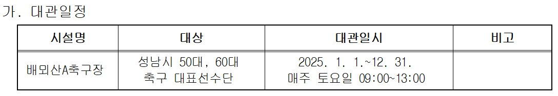 2025년도 배뫼산 정기사용 대관이 신청되어 다음과 같이 사용제한 되오니 축구장 이용에 참고하시기 바랍니다.