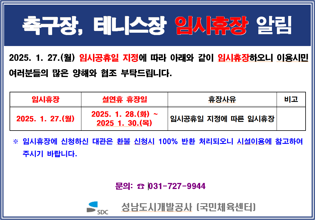 문의시설 - 탄천변체육시설: 031-727-9957 - 황송축구장: 031-733-8009 - 양지축구장: 031-731-2002 - 배뫼산축구장: 031-727-9944 - 상대원유소년축구장: 031-758-0053 안내문