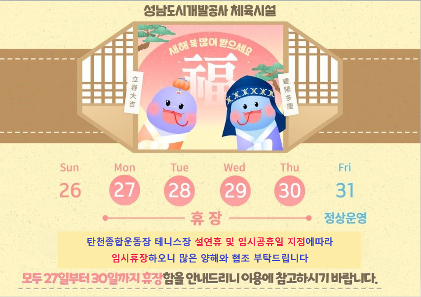 탄천종합운동장 설연휴 및 임시공휴일 지정에 따른 임시휴장 안내