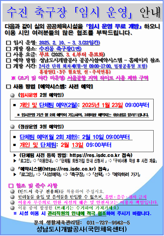 탄천종합운동장 설연휴 및 임시공휴일 지정에 따른 임시휴장 안내