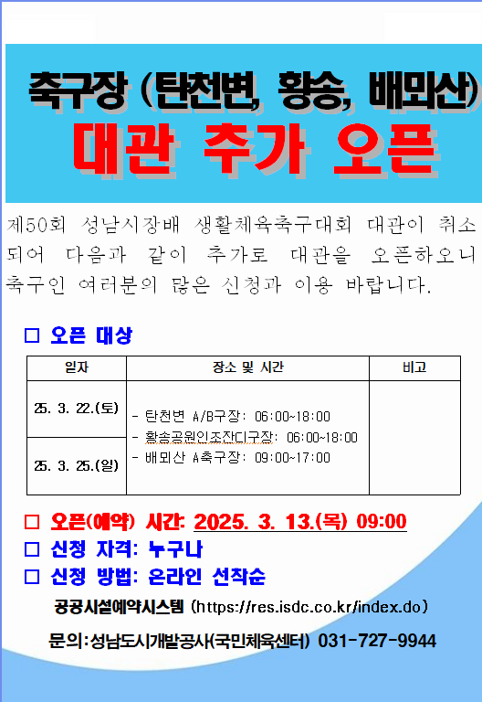 축구장 대관 변경에 따른 일반대관 추가오픈 알림