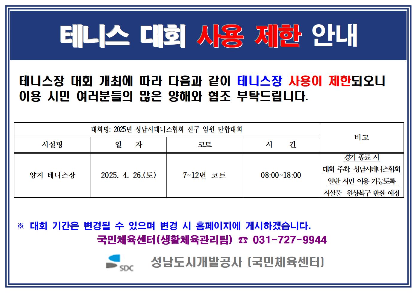 시립테니스장 사용제한 알림(4.12.~4.13.)