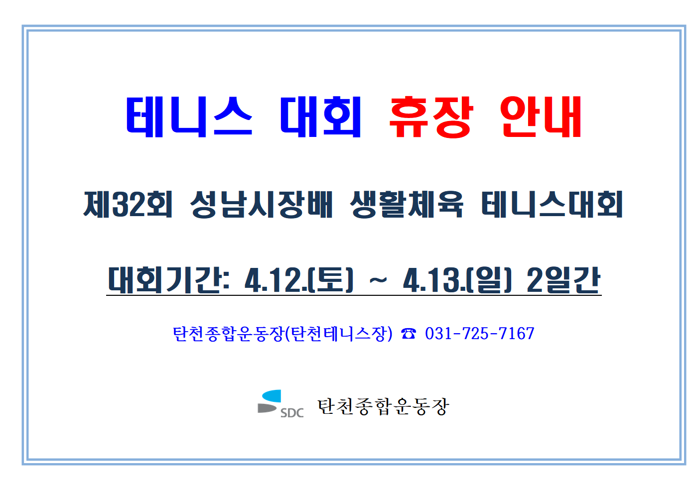 탄천테니스장 대회 관련 휴장 안내(테니스대회 4/12~4/13))