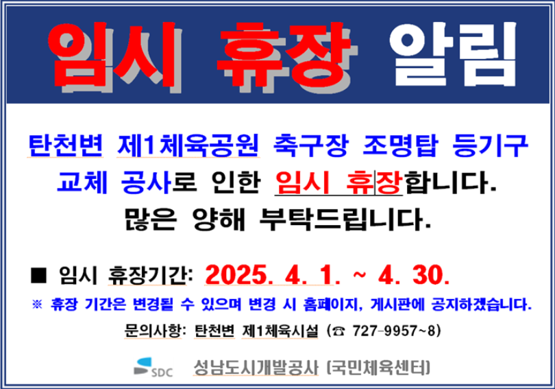 임시 휴장 일림(축구장 조명탑 등기구 교체 공사 관련)