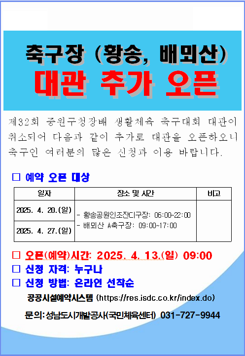 축구장 대관 추가오픈(2025.4.20./2025.4.27.)