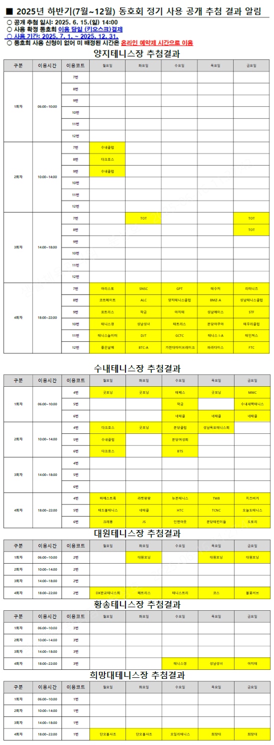 2025년 하반기(7월~12월) 동호회 정기 사용 공개 추첨 결과 알림