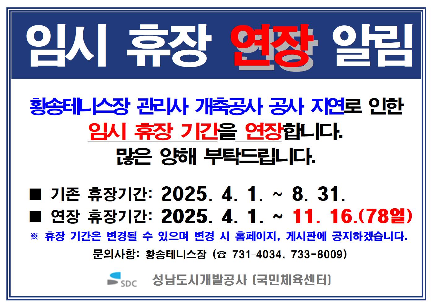 황송테니스장 임시휴장 연장 알림(팝업=>게시판 이동)
