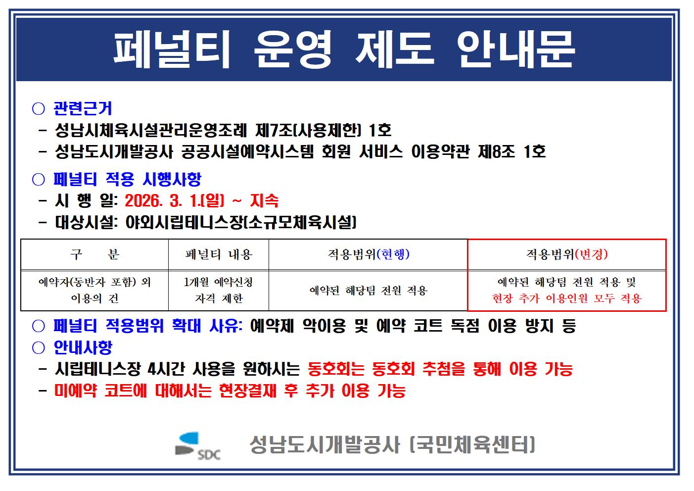 시립테니스장 페널티 운영제도 안내문