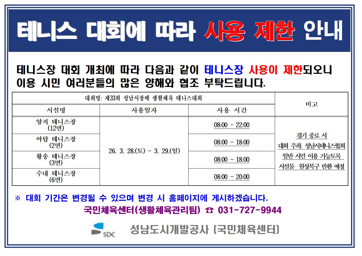 시립테니스장 사용허가 알림(제33회 성남시장배 생활체육 테니스대회)